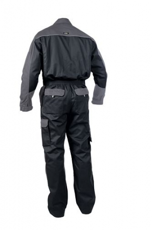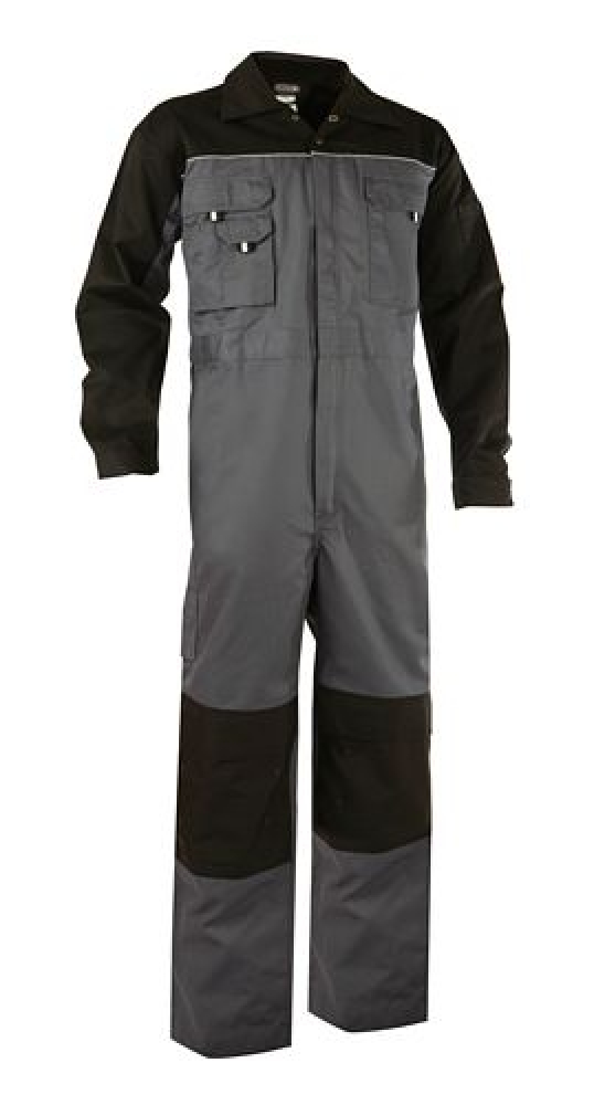 Dassy-Overall mit 3-fach Kappnähten, Ärmelbunde verstellbar, verdeckter 2-Wege-Reißverschluß, verstellbarer Gummizug in Taille, Seiteneingriff, 2 Brusttaschen mit Patte, Handytasche mit Patte und Stiftfächer, 2 Gesäßtaschen mit Patte, Schenkeltasche mit Patte und Unterteilungen, verstellbare Cordura-Knietaschen, Zollstocktasche,